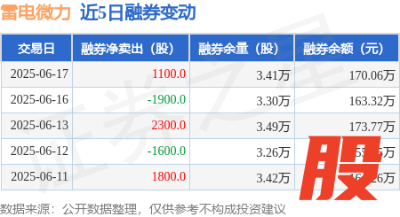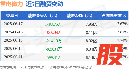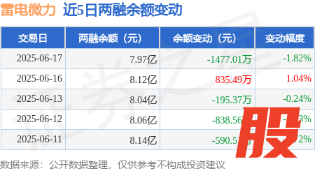 本站消息,6月17日,雷电微力(301050)融资买入4064.26万元,融资偿还5548.01万元威贤配资,融资净卖出1483.75万元,融资余额7.96亿元。