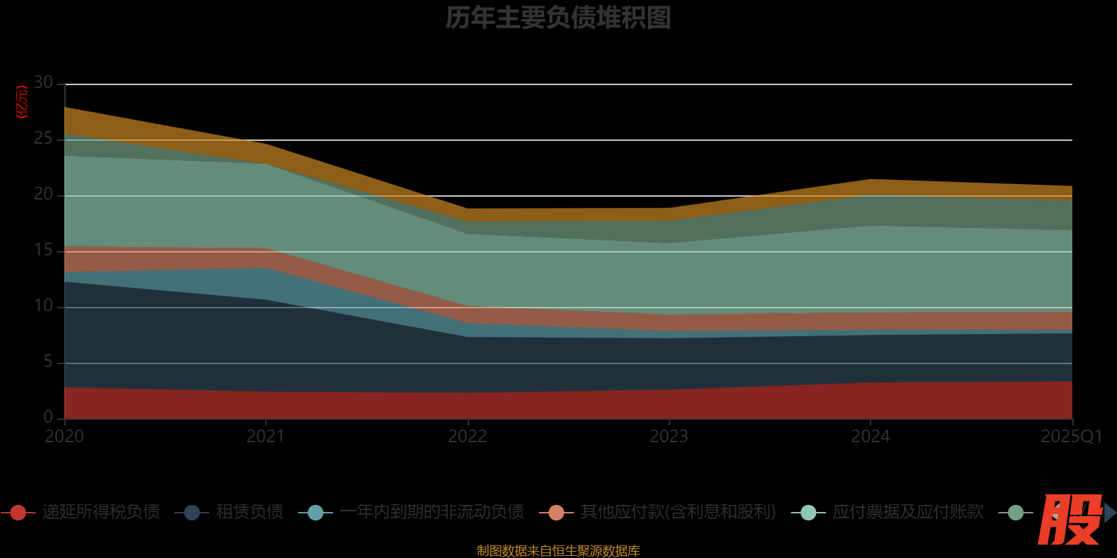 负债重大变化方面,截至2025年一季度末,公司应付票据及应付账款较上年末减少6.37%,占公司总资产比重下降0.75个百分点;合同负债较上年末减少18.34%,占公司总资产比重下降0.26个百分点;一年内到期的非流动负债较上年末减少31.64%,占公司总资产比重下降0.26个百分点;递延所得税负债较上年末增加2.77%,占公司总资产比重上升0.19个百分点。